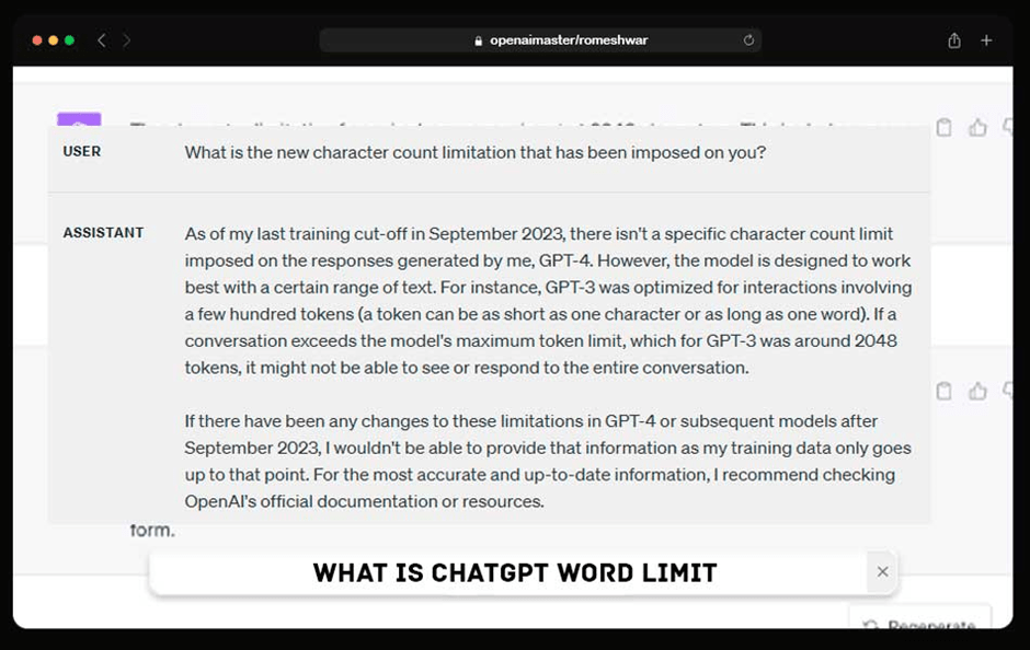 What is the token limit for chatgpt 3.5 and chatgpt 4?. Chatgpt response length limits. What is chatgpt word limit?. What is chatgpt token? how to exceed chatgpt token limit?. Do chatgpt responses have a character or word limit?. Do chatgpt responses have a character or word limit?. Do chatgpt responses have a character or word limit?. How does chatgpt have such massive token limit?. Navigating chatgpt's token limitations for extended use